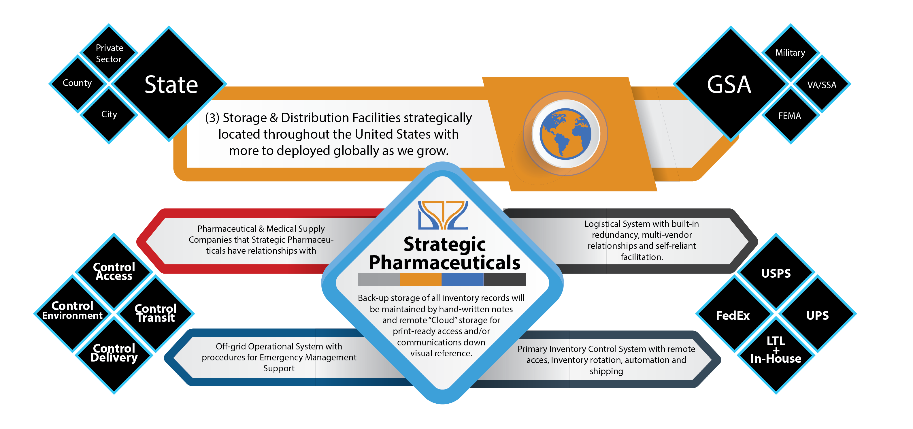 Strategic Pharmaceuticals does not disclose the intimate details of our operations platform or the technologies that we utilize to provide contract fulfillment. The model shown does however give a generalized outline of our operational platform showing the internal elements of various points of contact.